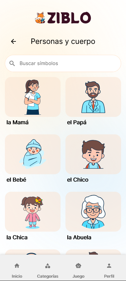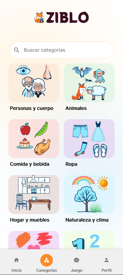 Los niños pueden tocar las imágenes para escuchar cómo se pronuncia cada palabra y, en muchos casos, también cómo suena en la vida real. Ya sean animales, colores, comidas u objetos cotidianos, Ziblo ayuda a los más pequeños a ampliar su vocabulario de forma natural y alegre.